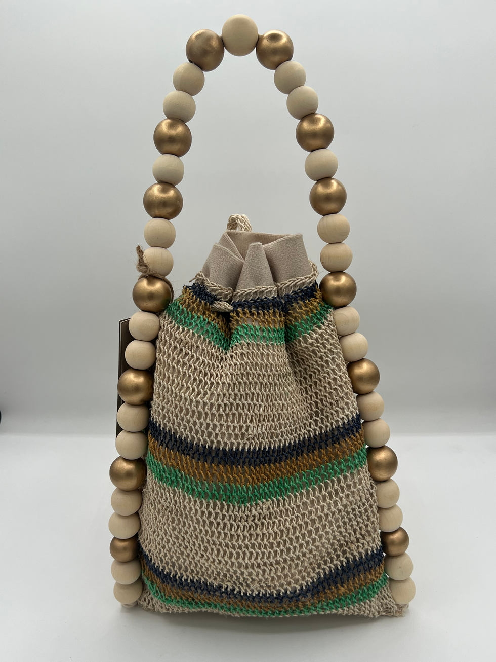 Bag made with natural fiber from the Pita plant, brand label in bronze with 24k gold plating, handle assembled in raw colored wooden balls with details of balls painted in two colors.